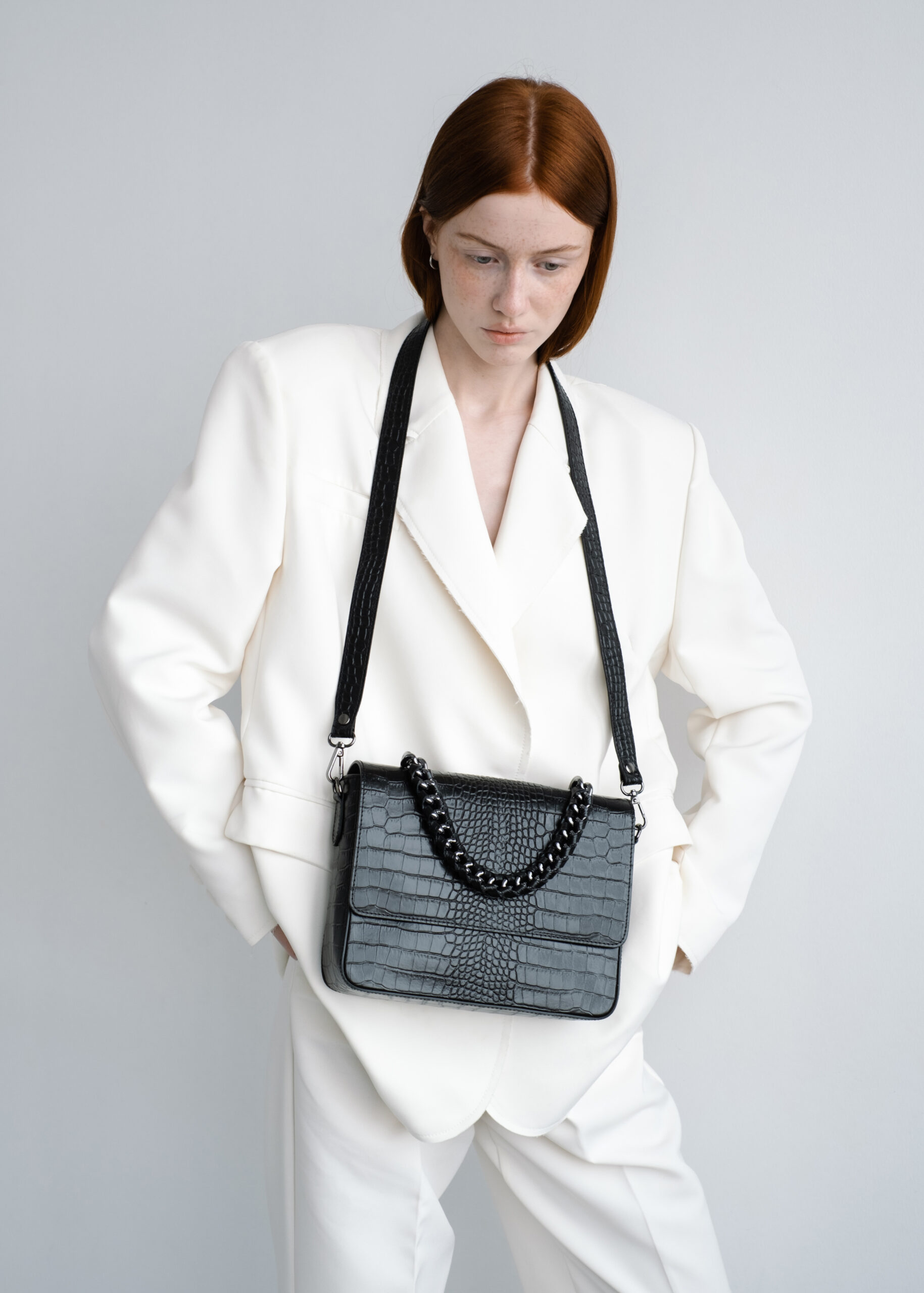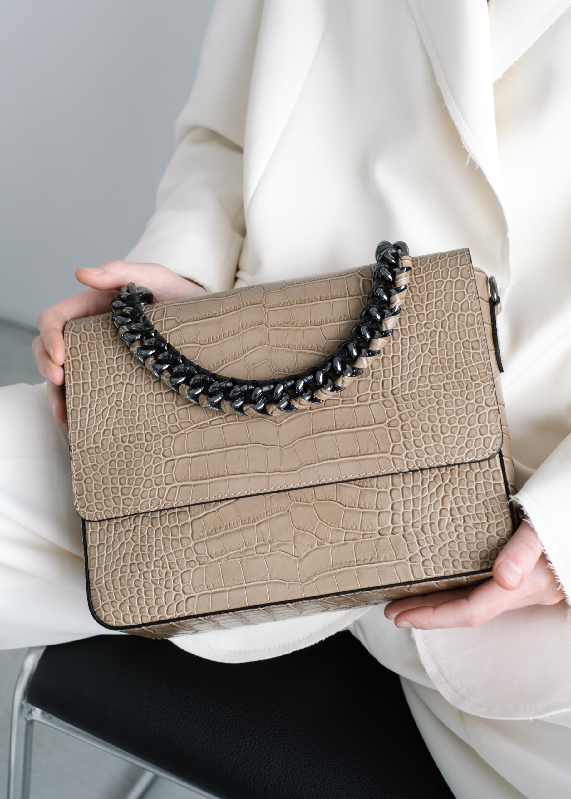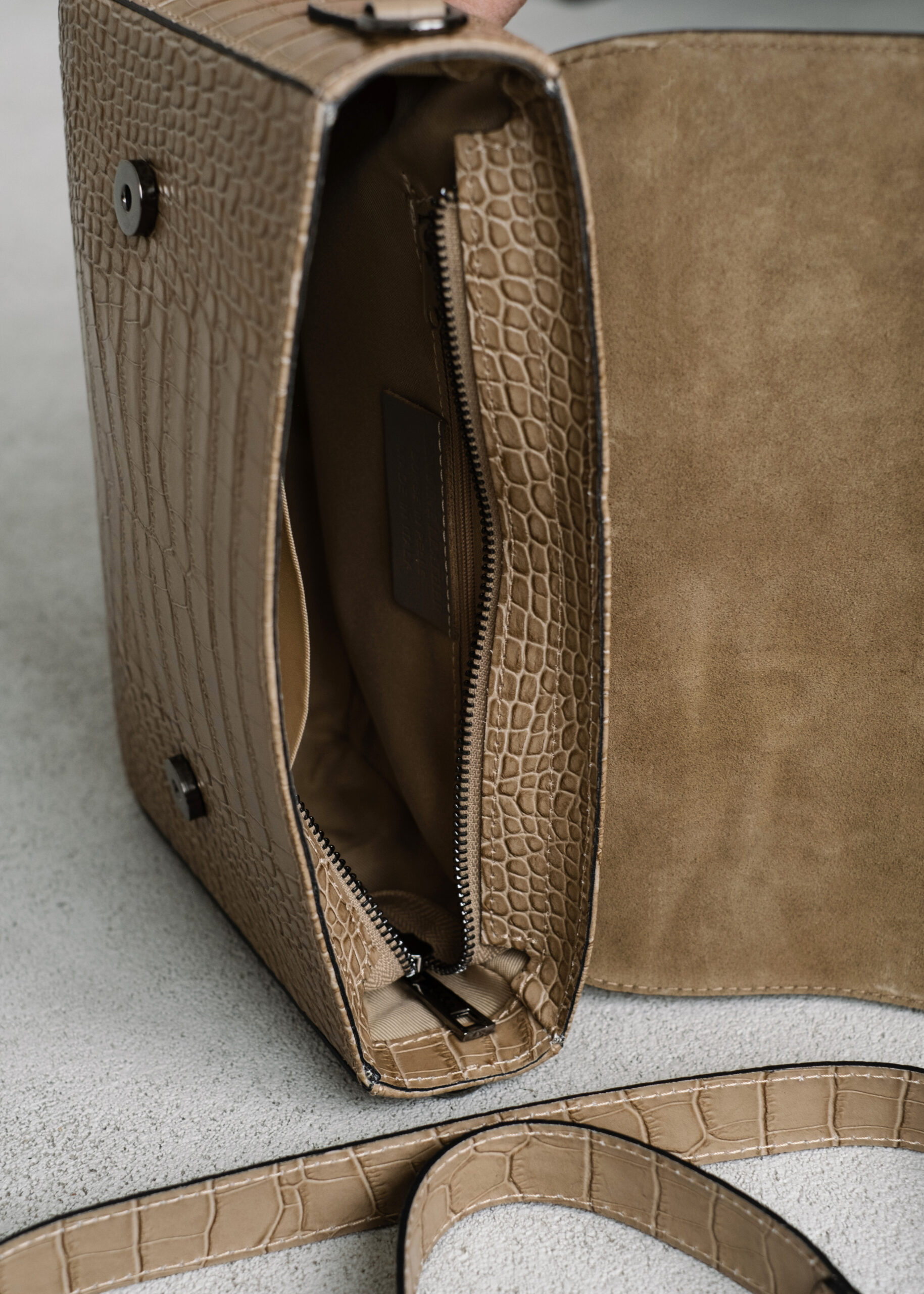 Сумка выполнена из натуральной кожи с тиснением под рептилию. Клапан застегивается на кнопка-магниты. Под клапаном сумка застёгивается на молнию. Внутри одно общее отделение и три боковых кармана, два открытых и один на молнии. Одна короткая ручка-цепочка и широкий длинный ремень на одно плечо. Ещё больше новинок в наших магазинах в Минске и в Гродно.