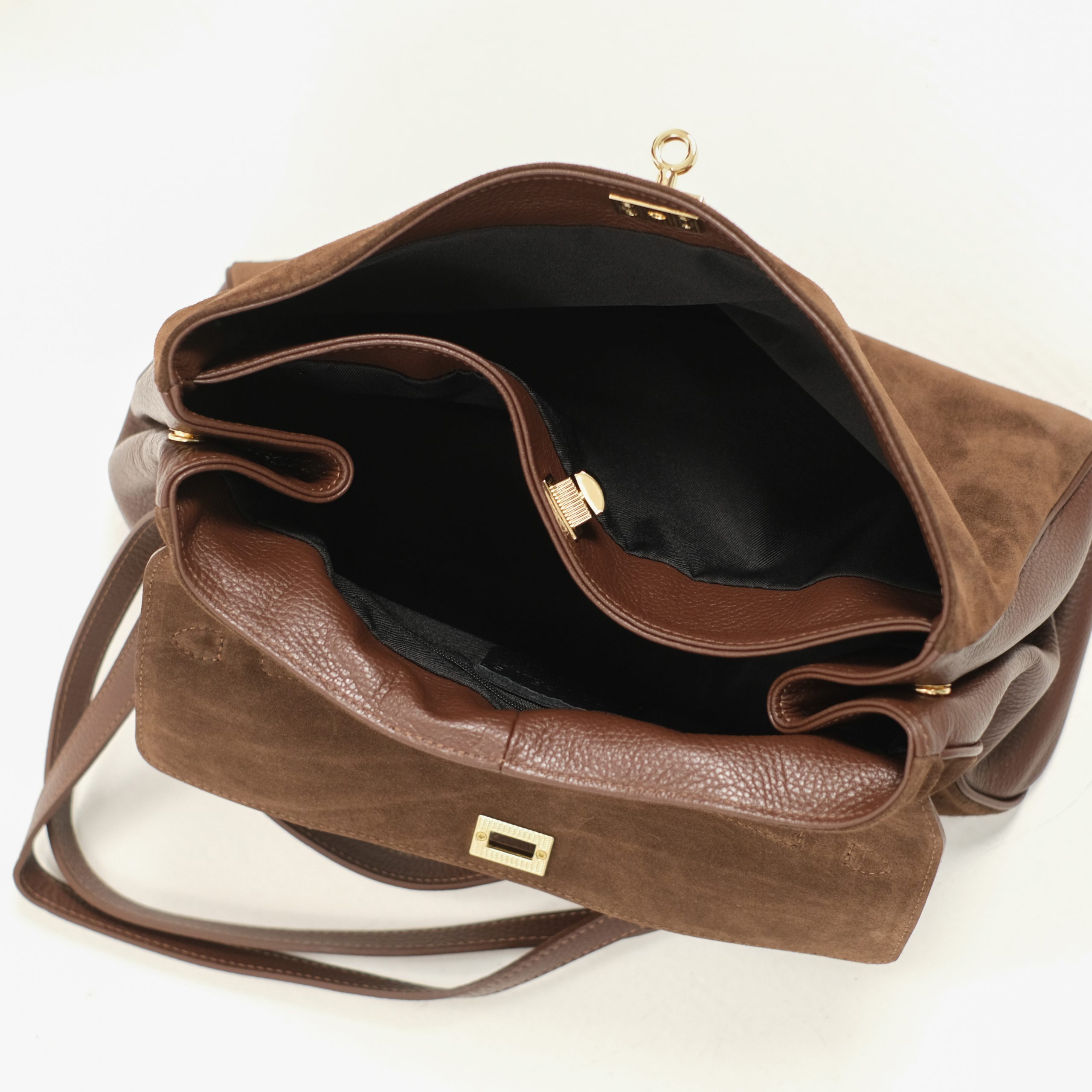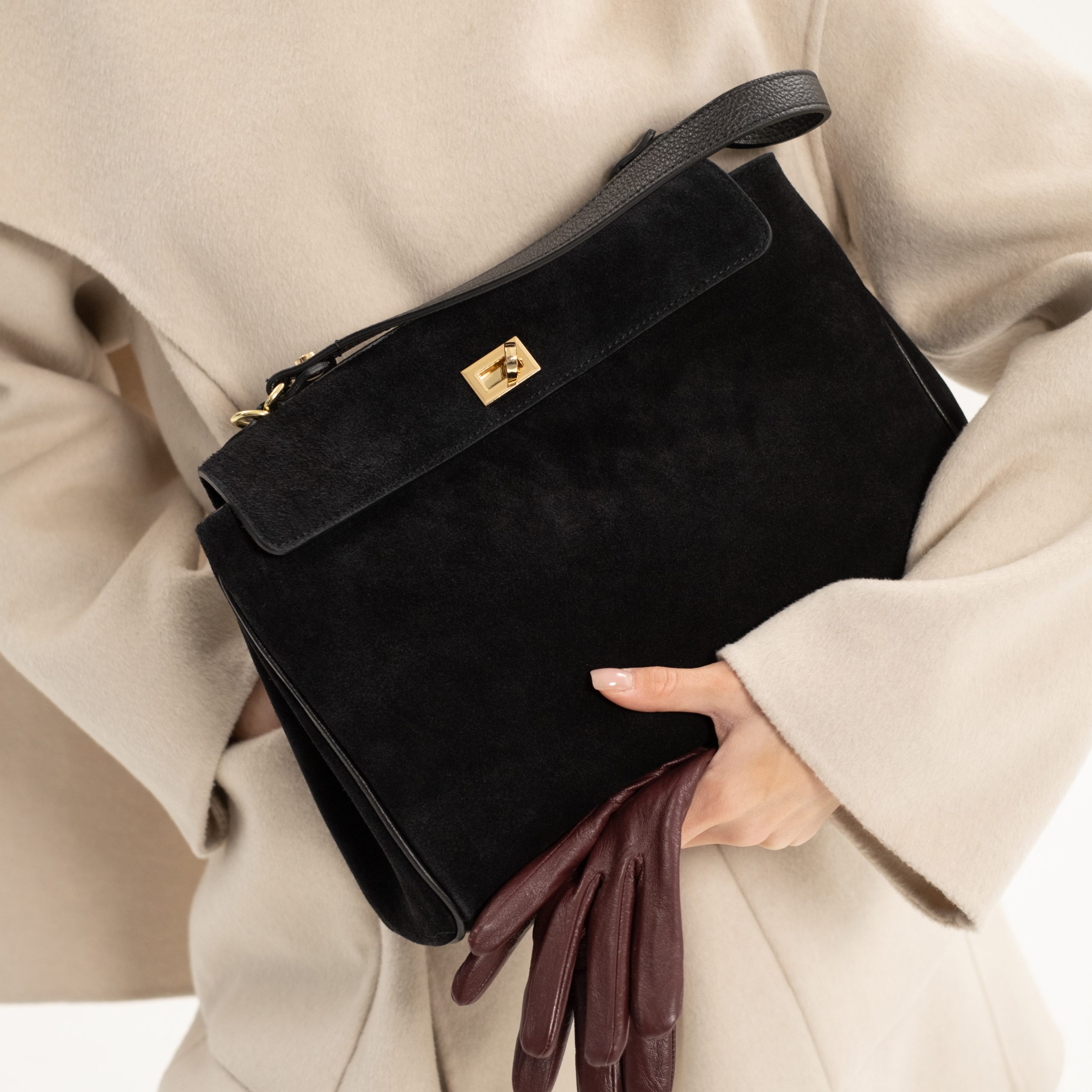 Сумка выполнена из натуральной замши. Сверху застёгивается на механическую застёжку. Внутри одно общее отделение и боковой карман на молнии, также есть плоское боеовое отделение. По бокам кнопки-фиксаторы. Одна короткая ручка и длинный ремешок, регулирующийся по длине. С обратной стороны сумки также есть наружный карман на молнии. Ещё больше новинок в наших магазинах в Минске и в Гродно.