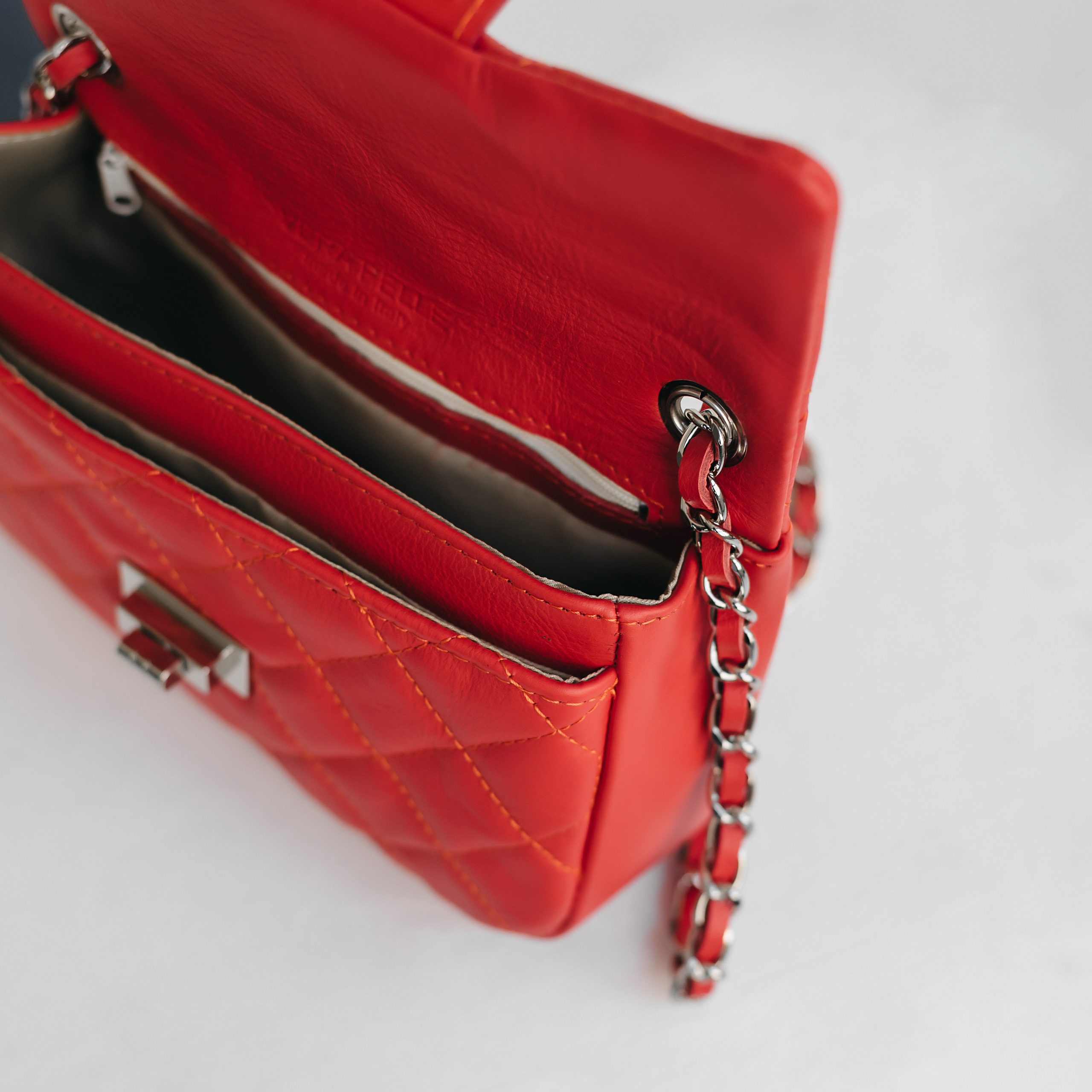 Сумка выполнена из натуральной кожи. Клапан застегивается на механическую застежку. Внутри одно общее отделение и боковые карманы, один открытый и один на молнии. Длинный ремешок-цепочка регулируется по длине. Ещё больше сумок в наших магазинах в Минске и Гродно.